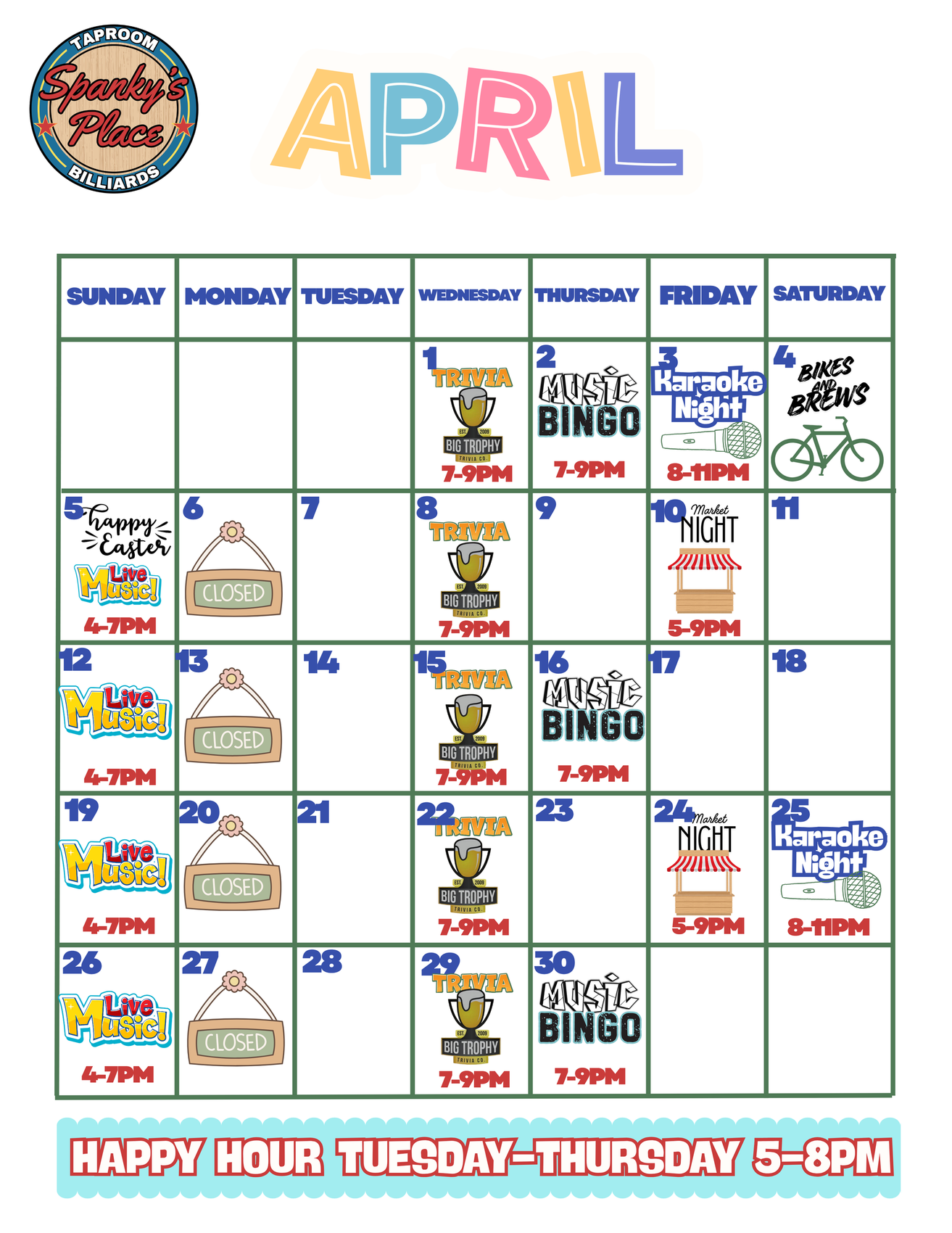 At Spanky’s Place Taproom & Billiards, you’ll find a rotating selection of craft beers, domestic favorites, ciders, seltzers and wine plus plenty of ways to play. Challenge your crew to a game of billiards, test your aim with darts, try your luck at bingo, show off your smarts during our lively trivia nights or just come play one of our board games with your best buddy or your favorite guy or gal. There’s always something happening and always a reason to stay for one more round.
